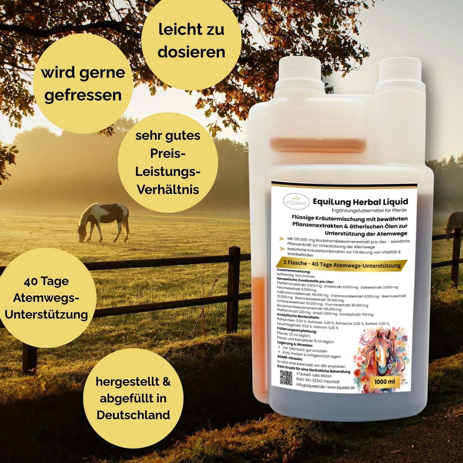 Inhalt: 1000 ml – reicht ca. 40 Tage bei Großpferden / ca. 66 Tage bei Ponys